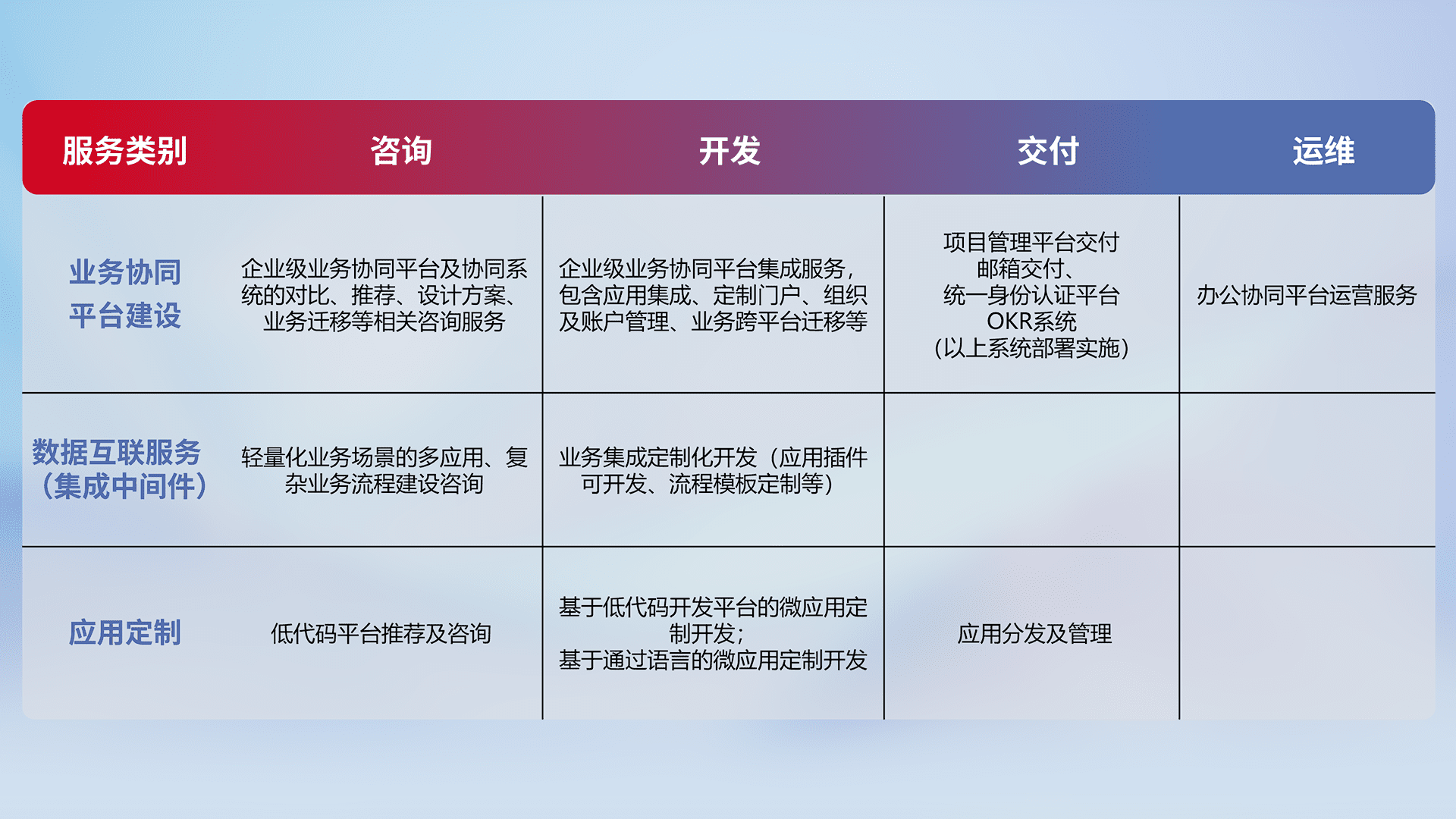 针对钉钉、、企微、、IDaas等平台级产品提供产品的规划、、、方案、、交付、、、、定制化开发等服务,,,实现如统一协同办公、、、、智能客户服务、、混合会议管理、、、、智能数据查询、、等业务场景,,,实现数字化转型。。。